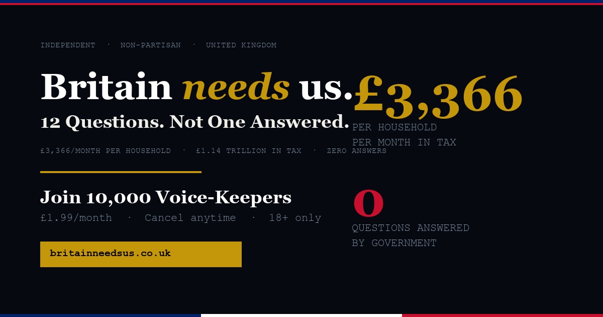 britainneedsus.co.uk reveals every hidden tax, audits government performance quarterly, and sends a formal open letter to the Prime Minister at 10,000 subscribers.